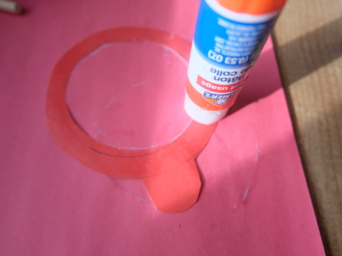 2. Trace a circle onto each coloured paper using a stencil or jar lid, and another slightly smaller circle inside of it half an inch apart. Add half a circle at the bottom of the bigger circle for the paper fastener.