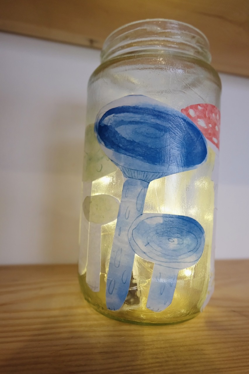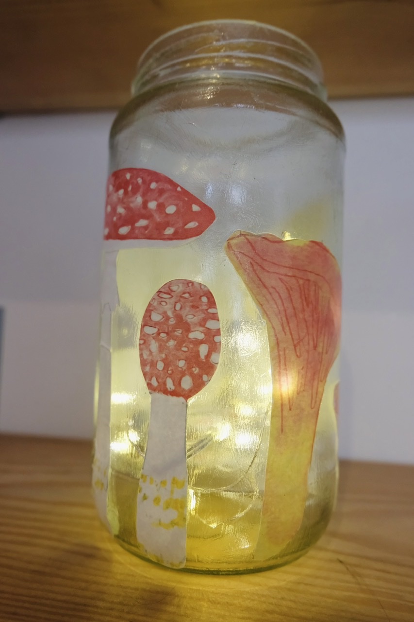 Trace the mushrooms onto tissue paper to create the tissue paper lanterns.