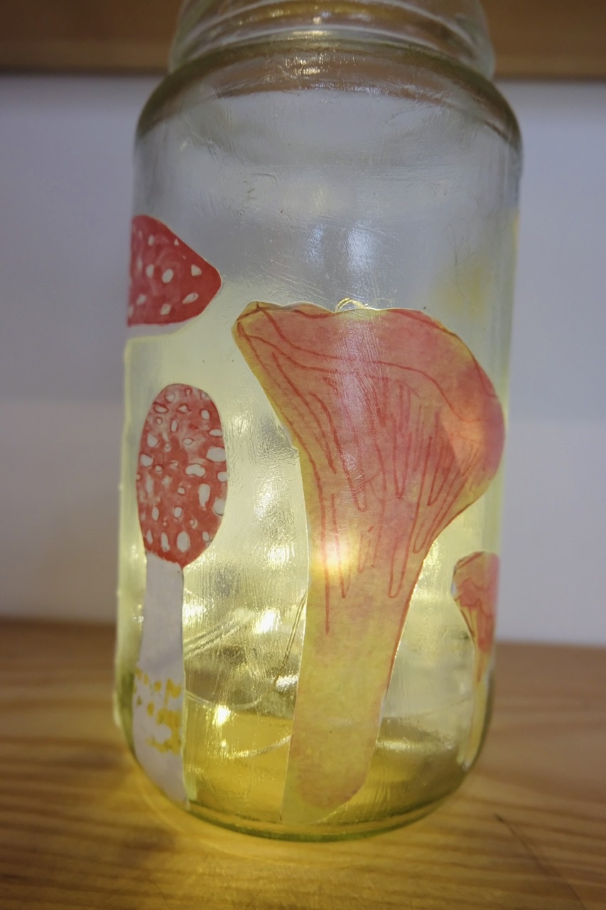 Create the mushroom jar lantern using our free printable and cutting each mushroom out and gluing it onto the jar the same way that you would glue the tissue paper; By applying the glue directly onto the glass jar first then placing the mushroom were you would like it to go. Place them close together to fit them all, or create a separate lantern for each mushroom.